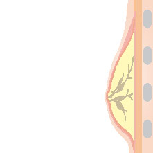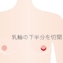 | 傷が目立ちにくい乳輪の下半分の円周を切開します。 | 乳腺・脂肪組織は薄い皮膜で覆われています。これらの組織を膜ごと切開した部分から摘出します。 | 切開部分を縫合して終了です。 |