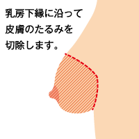 お胸の大きさにより皮膚の切除がどうしても必要な場合、乳輪も含めて皮膚切除し、たるんだ皮膚を縫合後に適切な位置に乳頭及び乳輪を移植します。